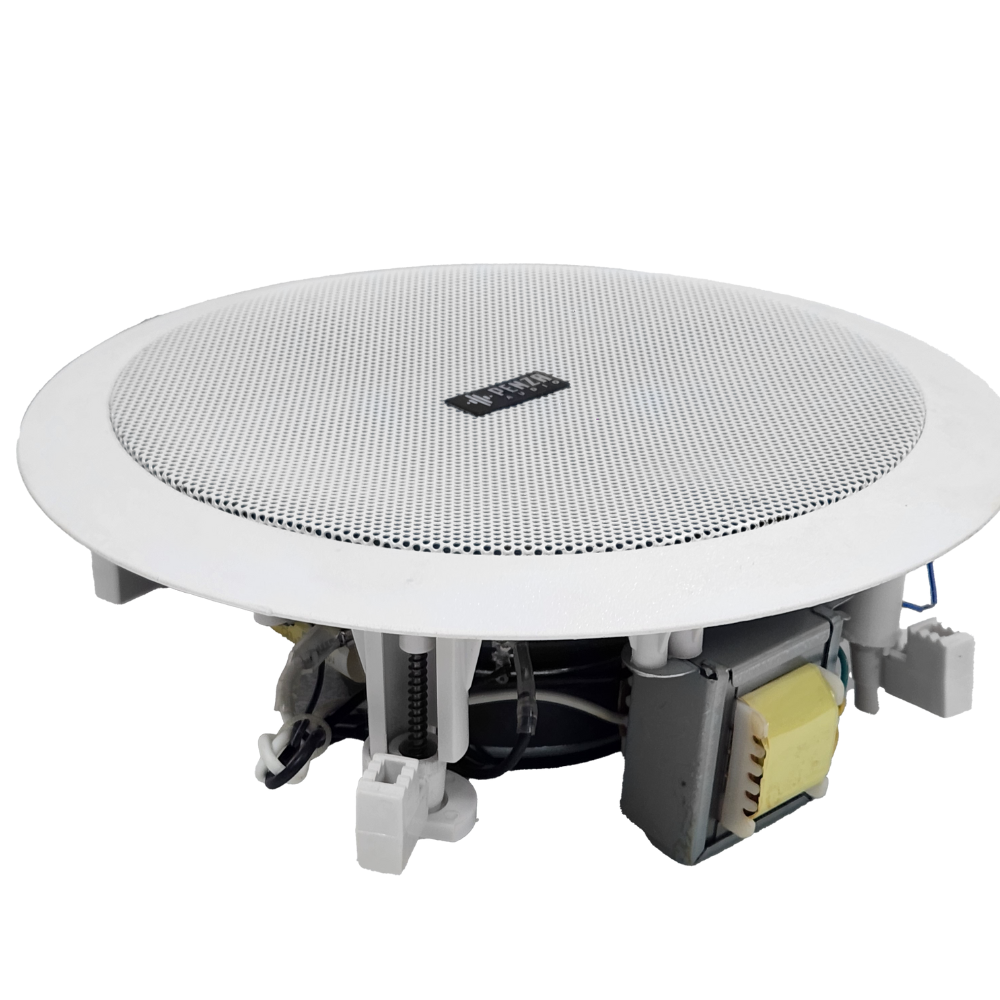 High-quality flush-mount ceiling speaker with stylish grill and frame, which integrates wonderfully well with all interiors. Clear and clean sound for speech and music, 5″/6″/8″ Full Range Speaker. Beautiful powder-coated aluminum mesh grille and moulded plastic frame. 100V line operation with easy power tap selection through a terminal block. Superbly engineered for simple and safe installations.